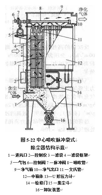 中心噴吹脈沖袋式除塵器的結(jié),含塵氣體由箱體下部進(jìn)入,粉塵阻留在濾袋外表面,干凈氣體穿過(guò)濾袋壁進(jìn)入袋內(nèi),然后由上箱體排出.清灰時(shí),脈沖閥受控制器的指令而開(kāi)啟,穩(wěn)壓氣包中的壓縮空氣經(jīng)噴吹管上的噴孔噴出,并借助位于袋口的文氏管...