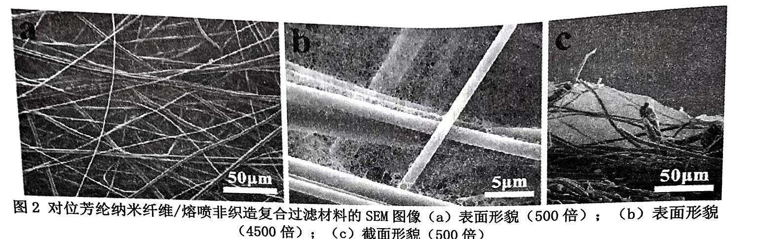 熔噴非織造材料表面形成了一層連續(xù),孔隙均勻的對位芳綸納米纖維膜,納米纖維之間形成孔隙的大小決定了覆膜熔噴非織造材料的孔徑.