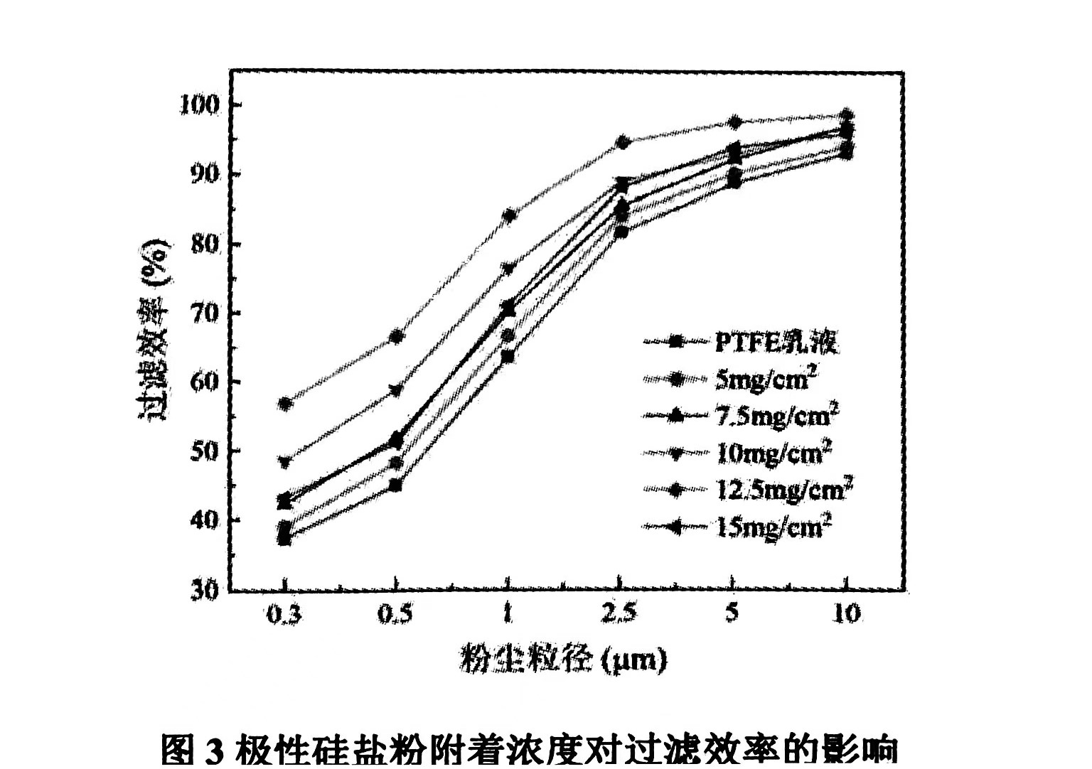 當(dāng)極性硅鹽粉附著濃度超過濾袋表面最大承載量時(shí),其在PTFE乳液中浸漬引起浮粉從而引起極性硅鹽粉的脫落,最終使得復(fù)合濾料表面涂層破壞而導(dǎo)致過濾效率的降低.