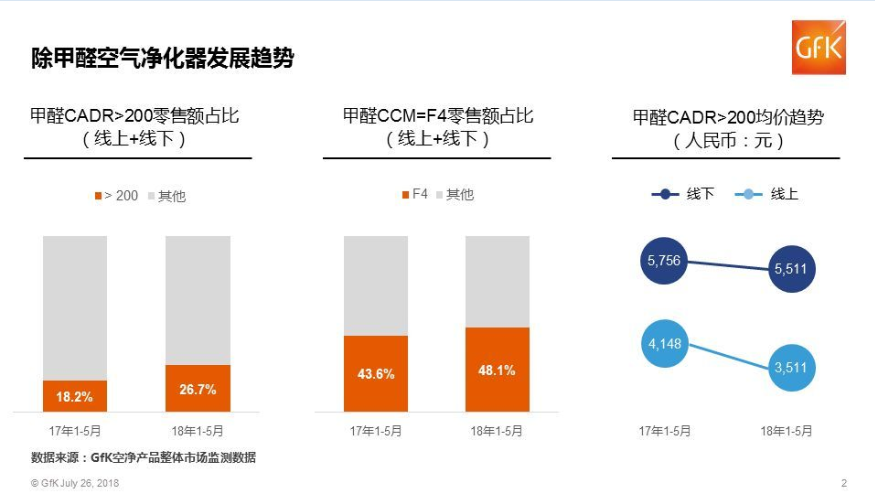 GfK數據顯示,2018年1-5月,家用空氣凈化器甲醛CADR(潔凈空氣輸出比率)在200以上的零售額占比同比增長接近9個百分點,甲醛CCM(累計凈化量)為F4級別的零售額占比同比增長接近5個百分點。