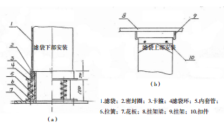 (2)在花板上平面安裝圖1(a)所示的向下拉緊裝置,該裝備由密封圈2、卡箍3、濾袋環(huán)4、內套管5、彈簧6組成。內套管長度應大于150mm,彈簧數(shù)量3根,總拉力250~300N。