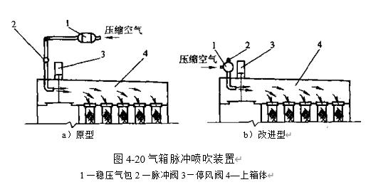 與其他噴吹裝置不同,氣箱脈沖噴吹裝置不設噴吹管,也不設引射器,而是直接將脈沖閥釋放出來的壓縮氣體輸入除塵器的上箱體,使上箱體在瞬間形成正壓,并傳遞到濾袋內,從而實現清灰.