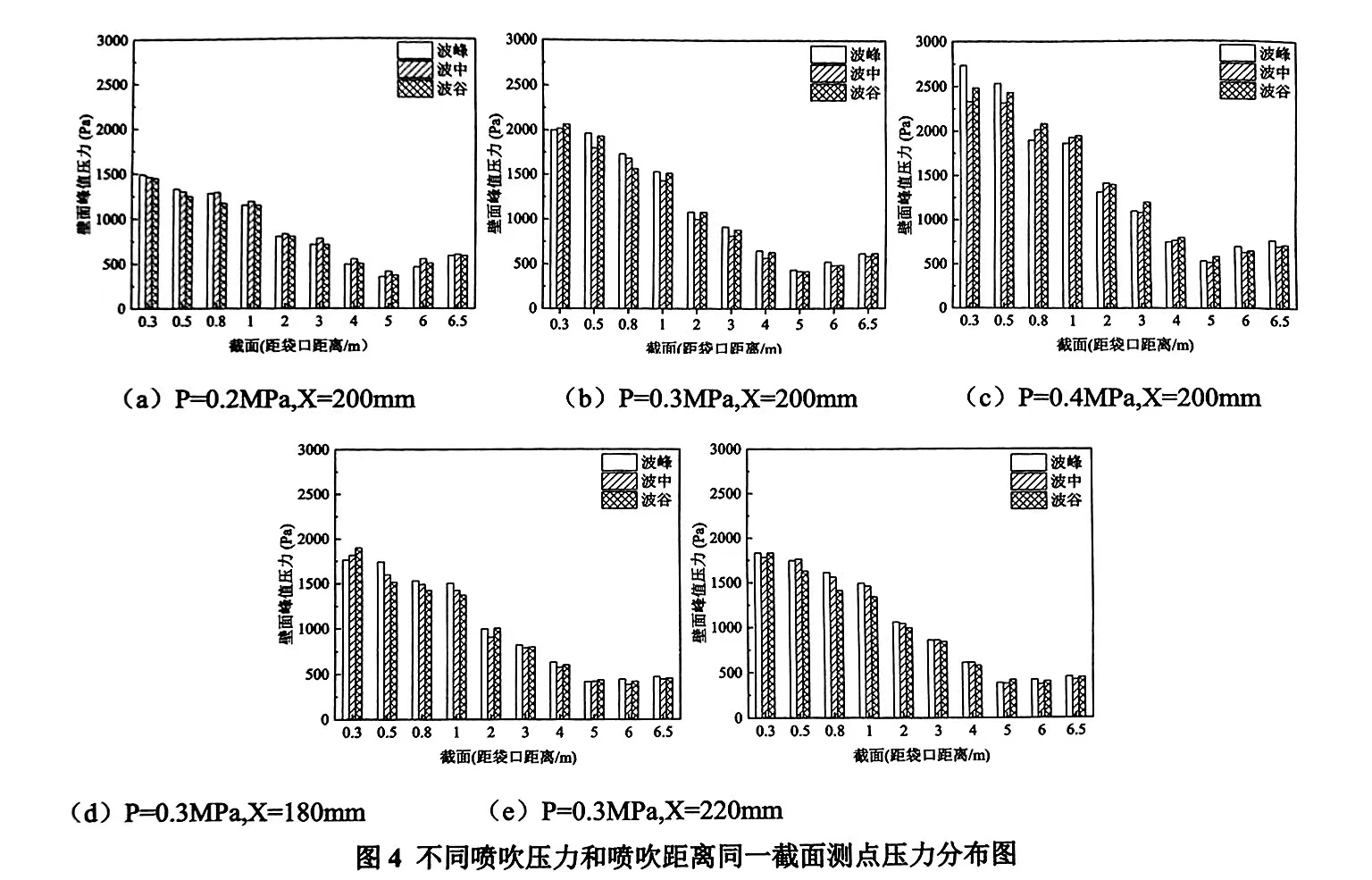 不同的噴吹距離對濾袋壁面峰值壓力出現的位置幾乎沒有影響.在一定的試驗條件下,褶皺形狀對壁面峰值壓力影響不大.