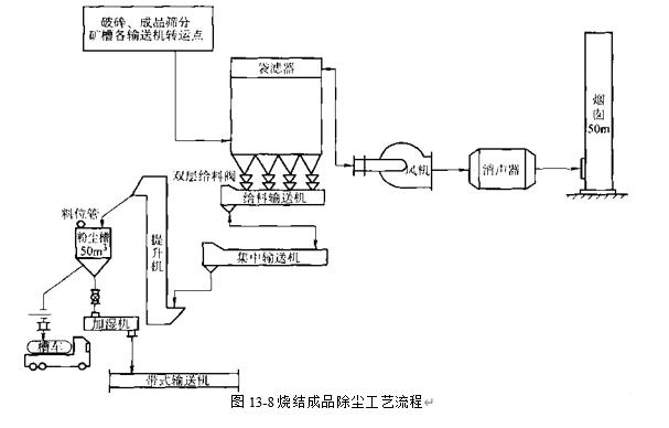 除塵工藝流程燒結成品工部除塵宜設計集中式除塵系統,選用分室反吹風或脈沖袋式除塵器,確保粉塵排放濃度小于50mg/m3(標準狀態).收下粉塵經鏈板輸送機和斗式提升機集中到粉塵槽內.