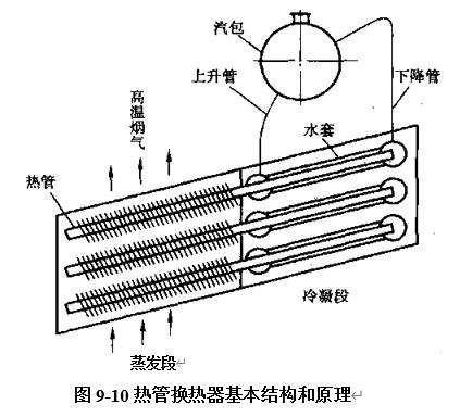 熱管是一種新穎的高效換熱元件.它將一束封閉管束抽成真空,內灌入傳熱工質,利用蒸發段(熱端)的吸熱蒸發效應,冷卻高溫氣體,同時利用冷凝肆(冷端)的放熱冷凝效應,加熱軟水汽化蒸發.