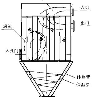 用于高溫高濕氣體的除塵器,筒體應光滑流暢,圓形筒體優于方形筒體,筒壁選用耐溫板材.為防止局部區域低溫結露,筒體內部應避免出現滯流區,須合理確定進排風口位置并釆取導流均流措施.