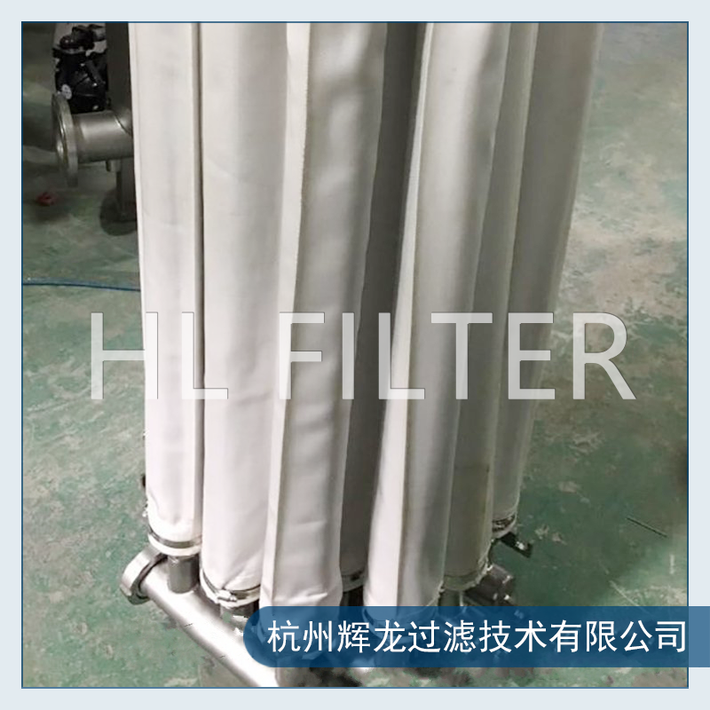 燭式過濾器的筒體里配置1至多根濾芯,濾芯上套有根據原料液特性選擇的專用濾布(PPS材質濾筒濾布, PTFE材質濾筒濾布,PVDF材質濾筒濾布,kevlar材質濾筒濾布),當液體經過濾布時,會在濾布表面逐步集聚液體中的固體物質當這些固體物質達到一定厚度時,就形成了所謂的“濾餅層”。由于濾餅層微粒之間的空隙很小,阻留了液體中顆粒